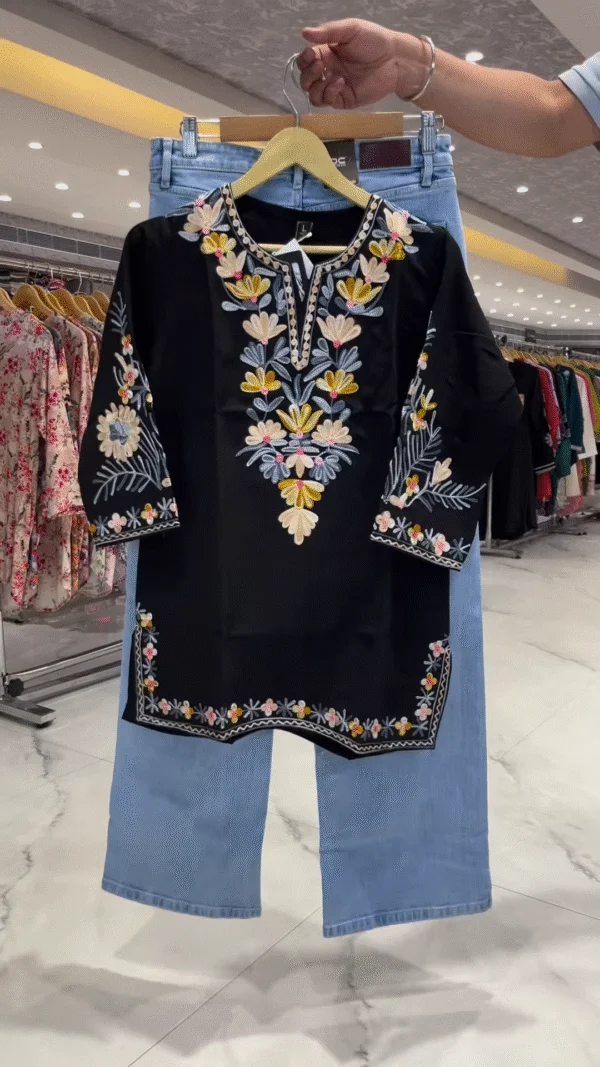 Elegant Multicolor Embroidered Black Kurti with Denim Pants – Fusion Chic Collection