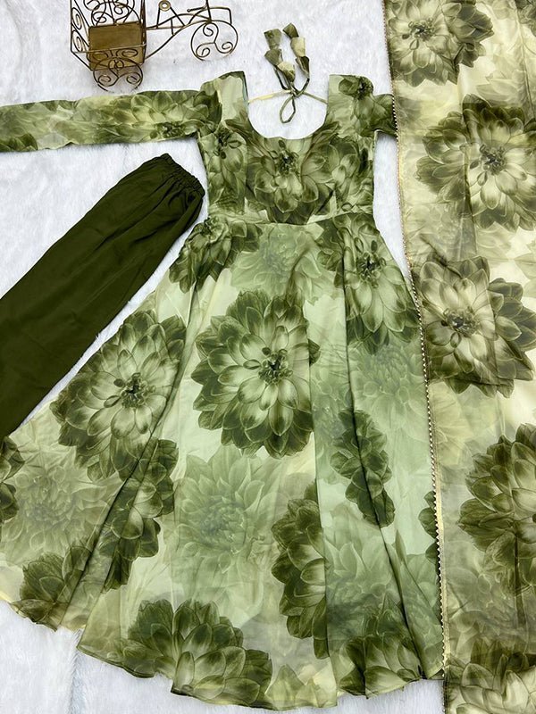 Mehandi Organza Printed Anarkali Gown With Pant & Dupatta Set